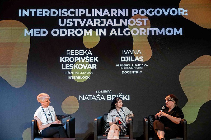 Med številnimi domačimi in tujimi strokovnjaki je nastopila tudi Rebeka Kropivšek Leskovar iz podjetja Interblock, Inženirka leta 2024, ki je v interdisciplinarnem pogovoru Ustvarjalnost med odrom in algoritmom z režiserko in pisateljico Ivano Djilas osvetlila presečišča med umetnostjo in tehnologijo ter humanistični pristop do etične tehnologije.